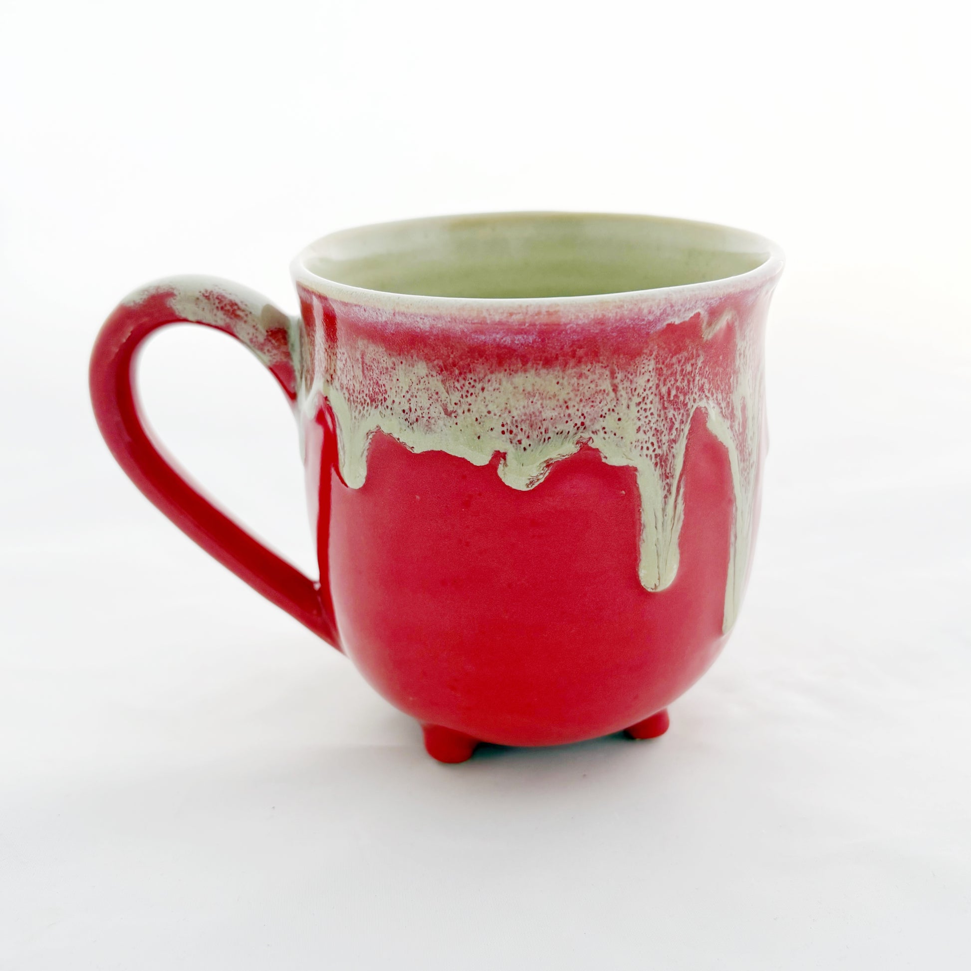 This whimsical cauldron mug will bring a little charm and magic to your daily routine. It was wheel-thrown and features four little feet attached to its base, while the handle was designed to satisfy both grip-the-handle and grip-the-mug drinkers. The beautiful solid-color exterior glaze provides the perfect backdrop to the dripping effect, and the interior glaze matches the color of the drips.