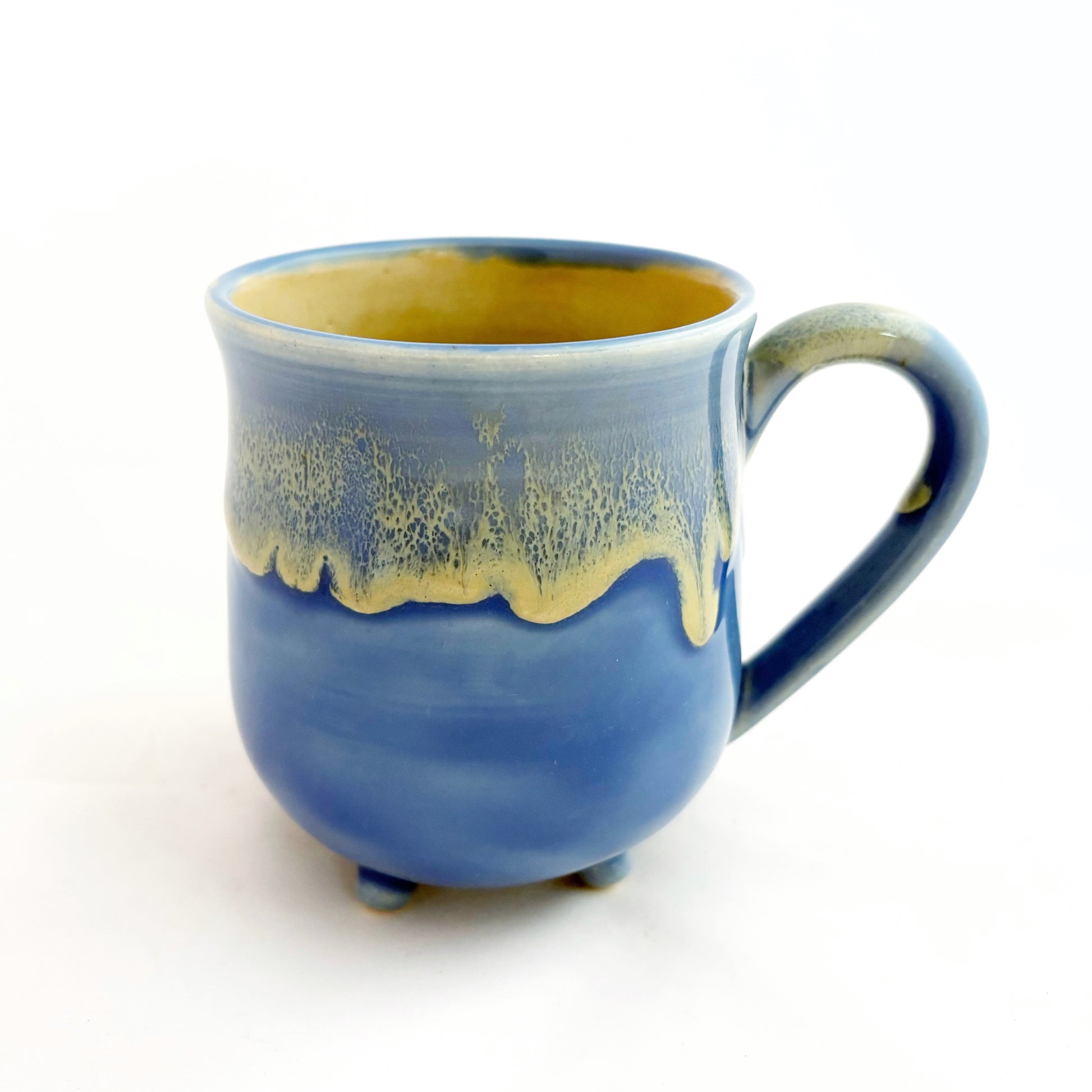 This whimsical cauldron mug will bring a little charm and magic to your daily routine. It was wheel-thrown and features four little feet attached to its base, while the handle was designed to satisfy both grip-the-handle and grip-the-mug drinkers. The beautiful solid-color exterior glaze provides the perfect backdrop to the dripping effect, and the interior glaze matches the color of the drips.