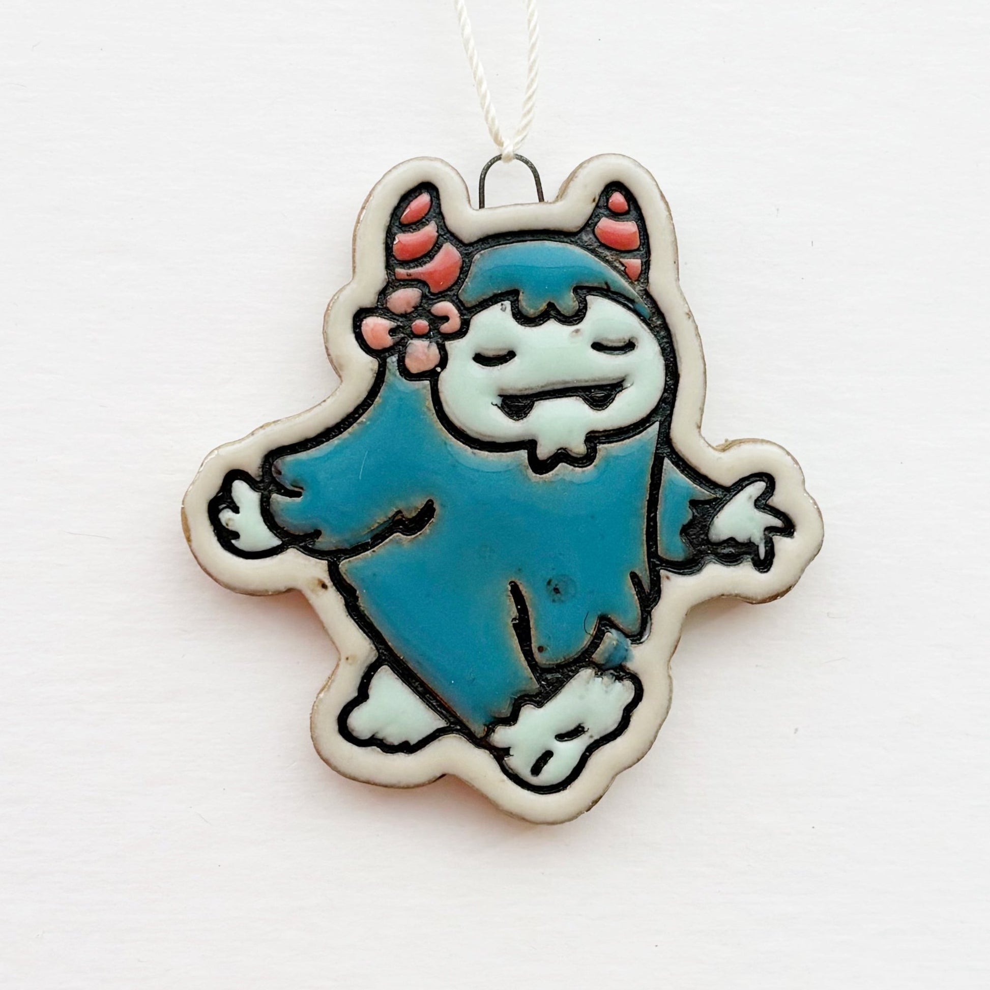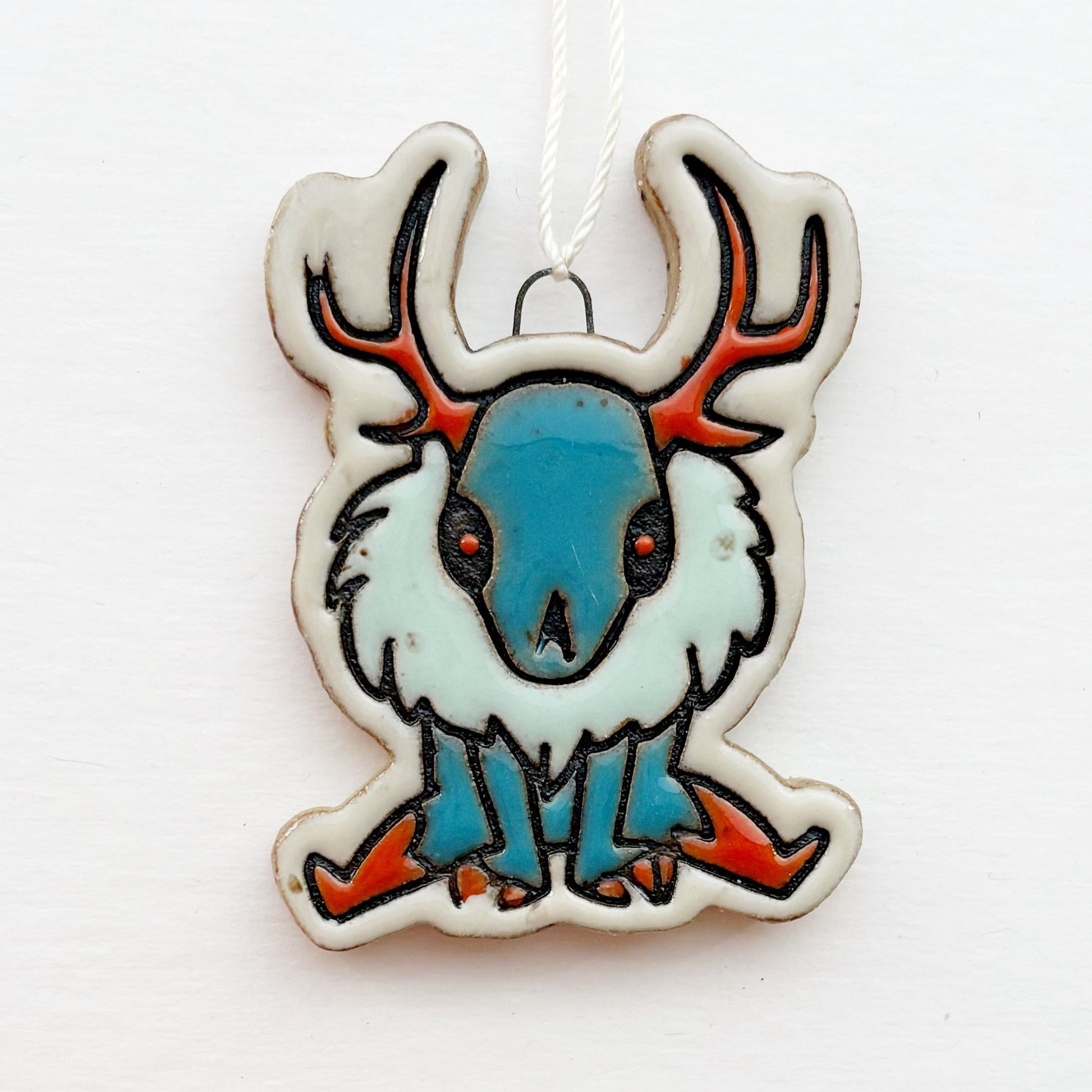 These cryptid cuties are the perfect addition to your holiday traditions. Just look at how merry and bright they are! Each ornament was hand-rolled, carefully embossed, and painstakingly hand-painted. The black outlines are unglazed impressions in the clay and the colored portions are glazed, glossy, and smooth. Each ornament has a fired-in wire that is super sturdy, and a simple white thread.