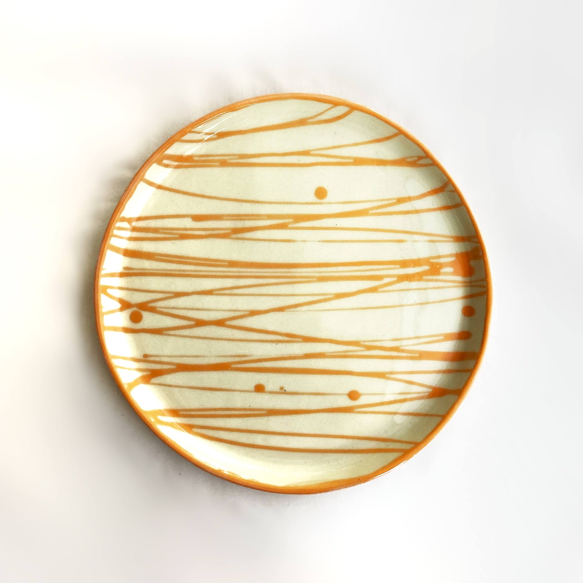 This plate is made of durable ceramic stoneware and is microwave-safe and dishwasher-safe. It is incredibly lightweight and has a small vertical lip around its perimeter. The colorful design on its surface is hand-painted and one-of-a-kind.