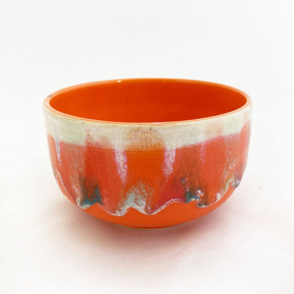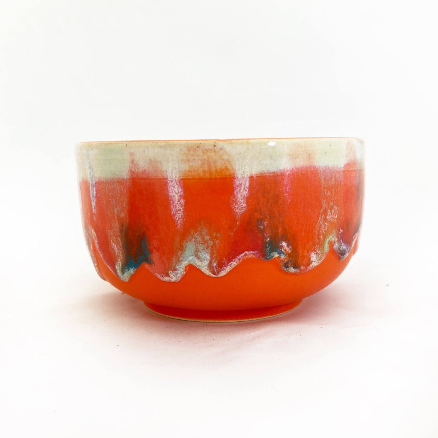 Do you like dessert? Do you like bowls? Do you like bright colors? This is the listing for you. This bowl features a bold! bright! orange! on both the interior and exterior, with a coordinating multicolor glossy drips along the exterior. It'll brighten your day each time you use it!