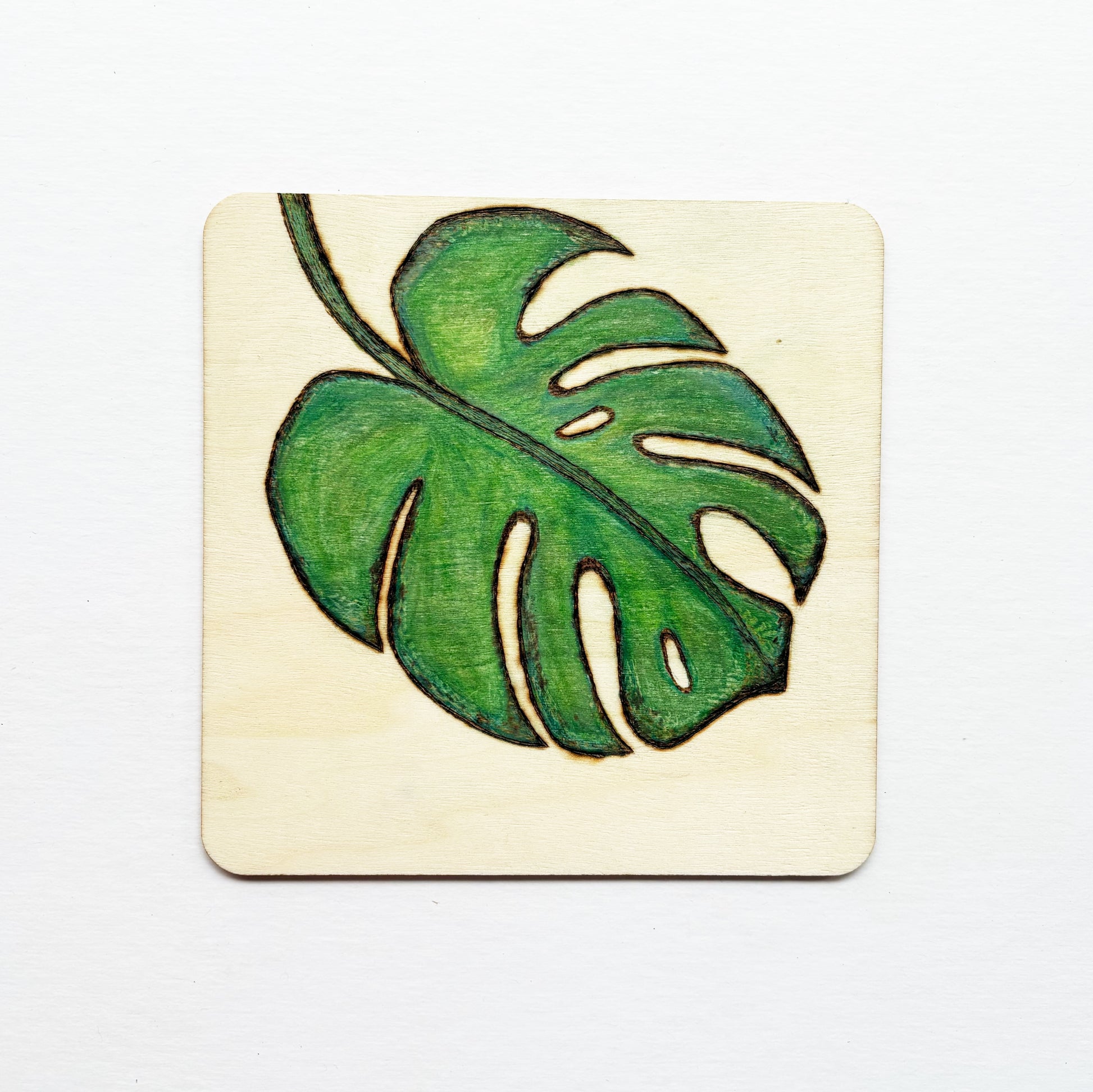 This small wall hanging features a striking pyrography design on smooth, natural basswood. The piece playfully depicts a large monstera leaf, rendered with strong lines and bright greens. The greens and deep, rich burned outline of the pyrography contrast beautifully, adding depth and character.