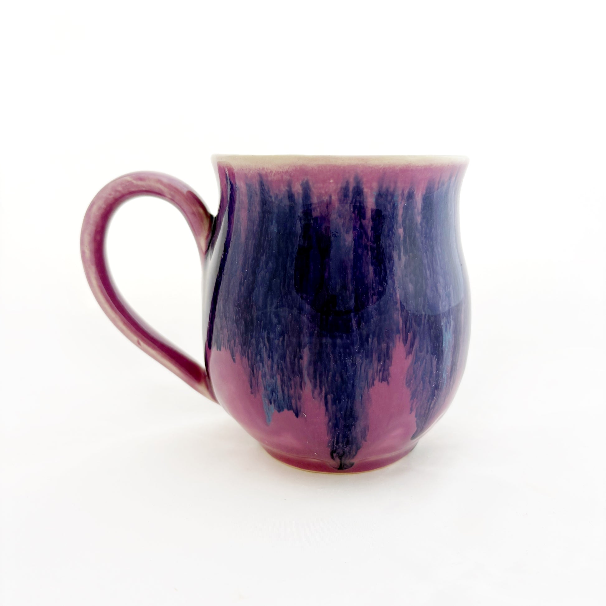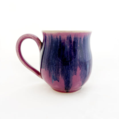Featuring a glossy symbol on the exterior, set against a purple background with blue drips. The interior is a glossy and subtle light pink. This mug is microwave safe and dishwasher safe.