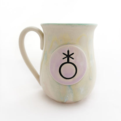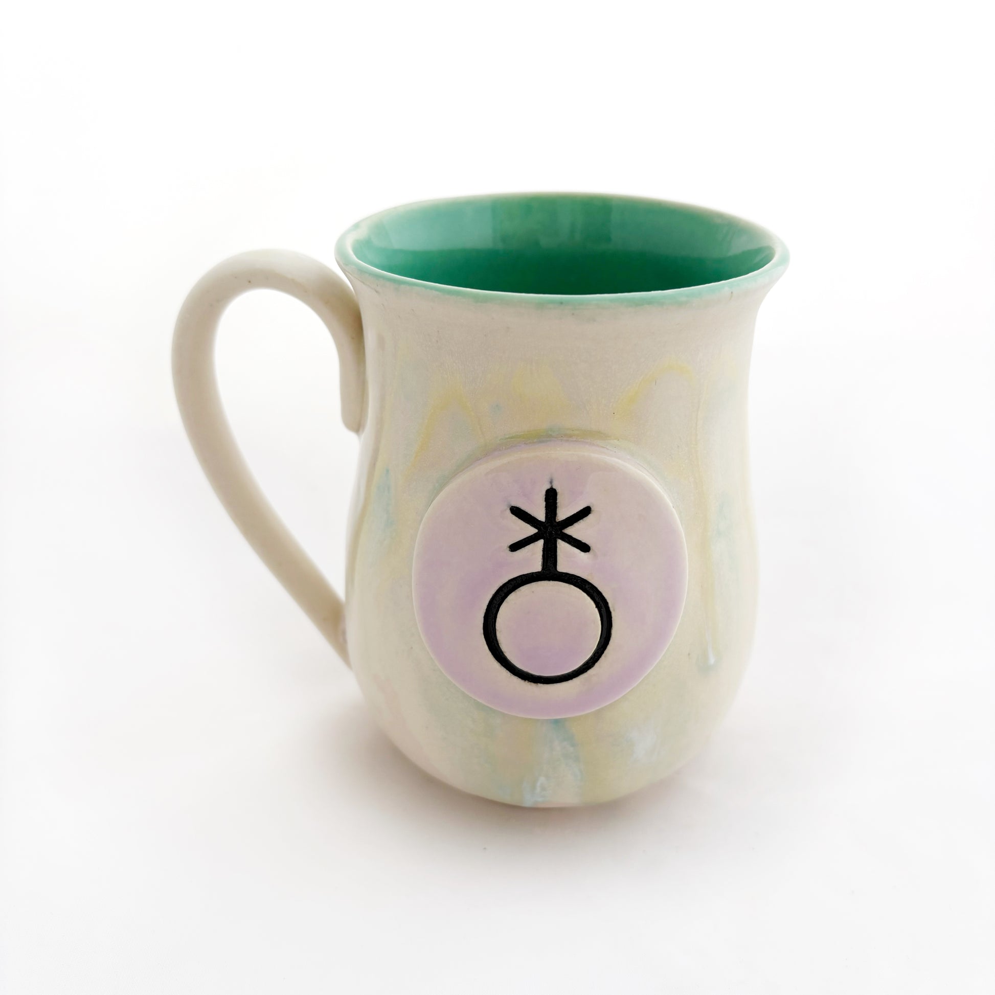 Featuring a light purple symbol on the exterior, set against a smooth pale body with subtle iridescent shimmers. The interior is a glossy green. This mug is microwave safe and dishwasher safe.