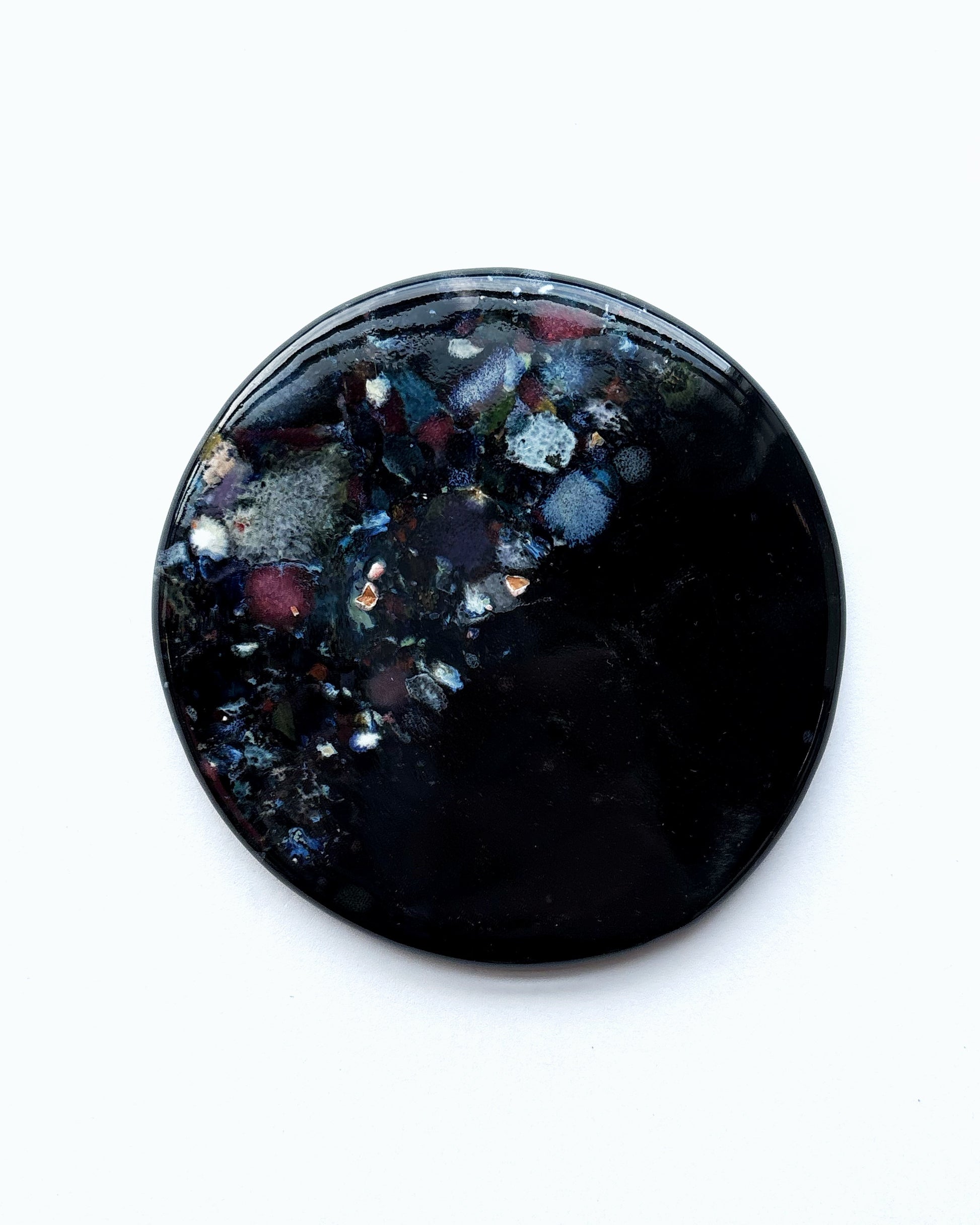 These coasters are handmade and hand glazed, and the speckles between any two coasters will never be exactly alike. Each coaster is backed with cork to ensure smooth contact with your table.