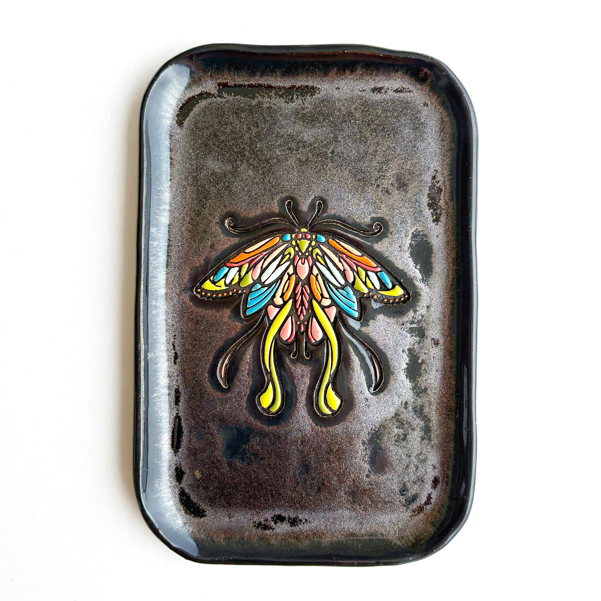Each platter is hand-built and adorned with a debossed design, then carefully glazed along the raised portions of the designs. The bright colors of the design itself contrast against the smooth, matte background.
