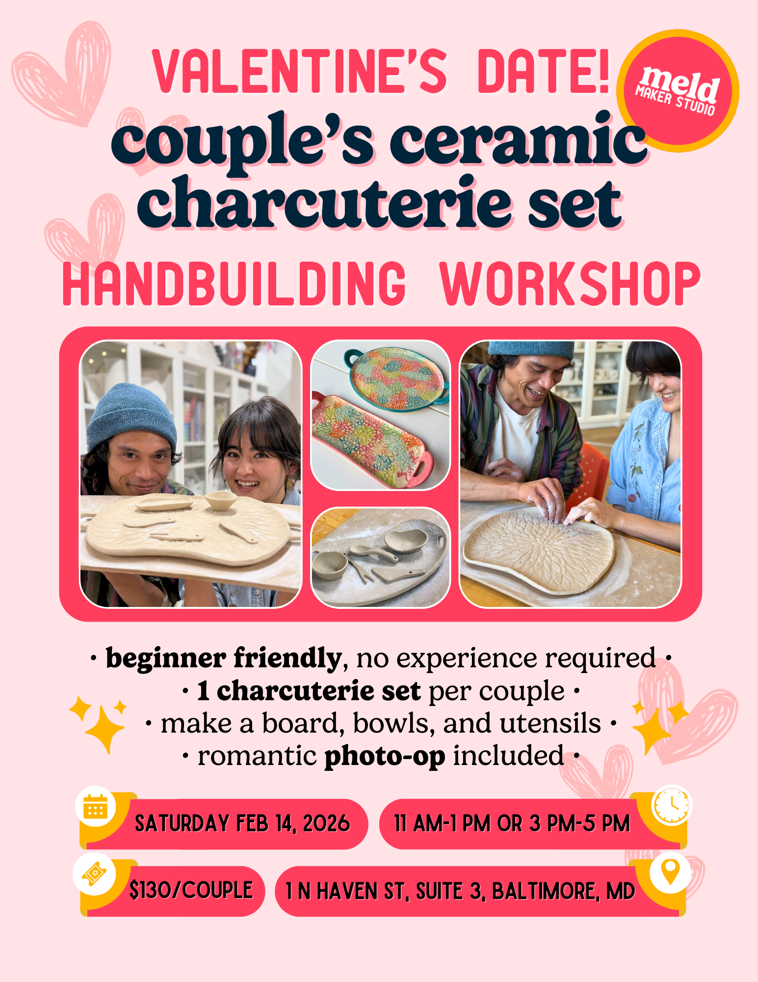 This workshop is beginner-friendly and all experience levels are welcome. We will teach you how to craft items with clay slabs and hand building techniques. We can also take cute photos of you working together as a couple if you’d like. Be sure to arrive on time to ensure you have ample time to create your art.