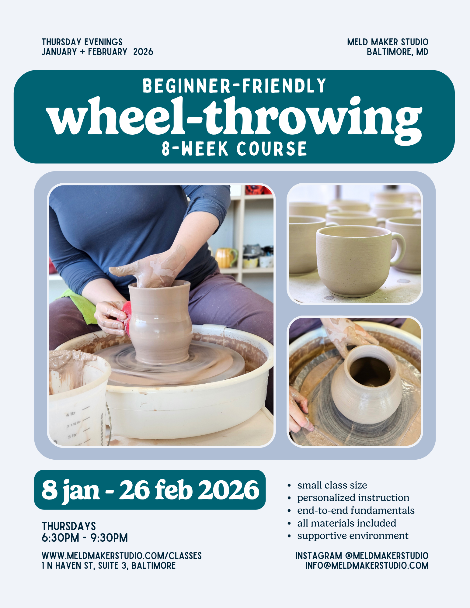Join us for an 8-week long, beginner-friendly, all-inclusive wheel-throwing course at Meld. We'll cover all the basics to get you started — from a lump of clay in a bag through to a finished piece you can eat off of, drink out of, admire, use daily, and enjoy for years to come.